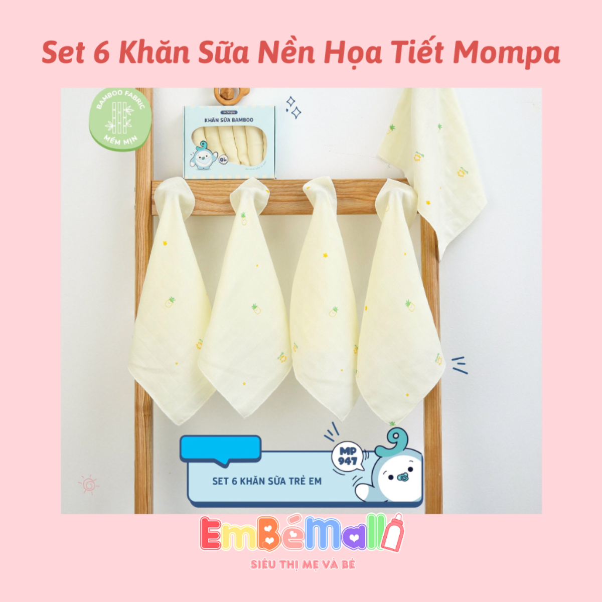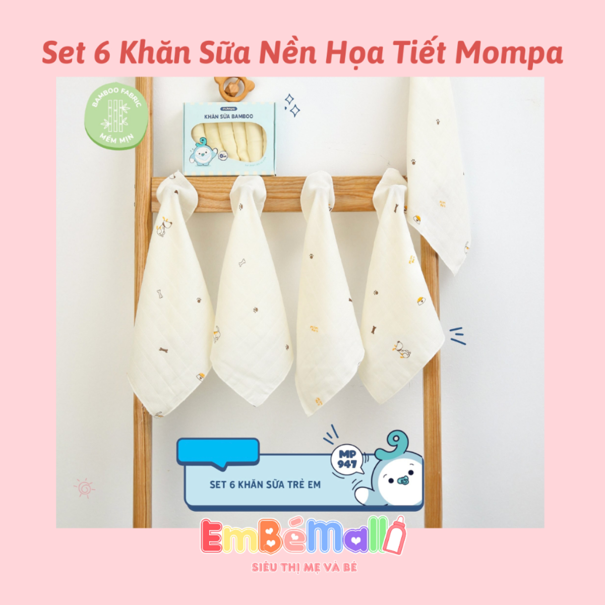 TÊN SẢN PHẨM: Khăn sữa cho bé Mompa SET 6 chiếc vải xô Bamboo lau mặt quàng cổ mềm mịn thấm hút đa năng